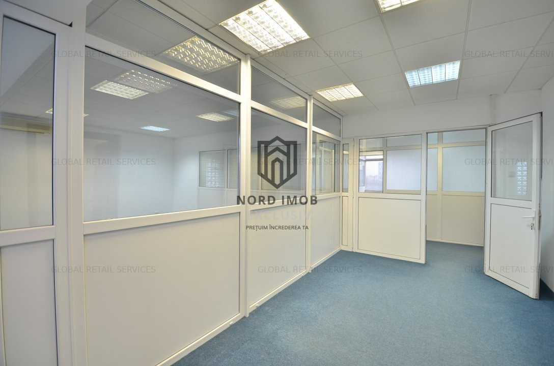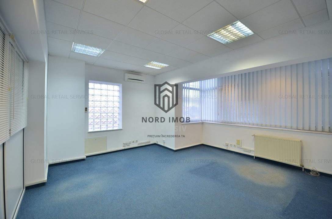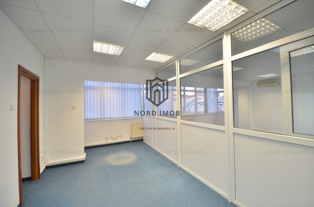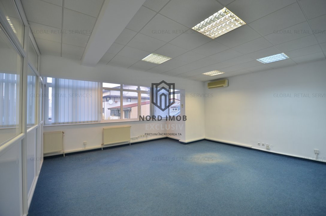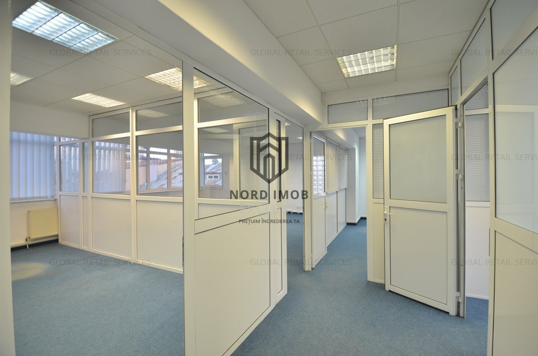 Suprafata disponibila inchiriabila: 242 mp (un etaj integral), din care suprafata utila 209 mp, compartimentata in: 8 birouri, kitchineta, 2 bai si sala de luat masa, precum si 30mp de garaj care poate fi folosit si ca loc de depozitare spatiu primire receptie, chicineta, 2 grupuri sanitare, 8 birouri/camere compartimentate, hol,