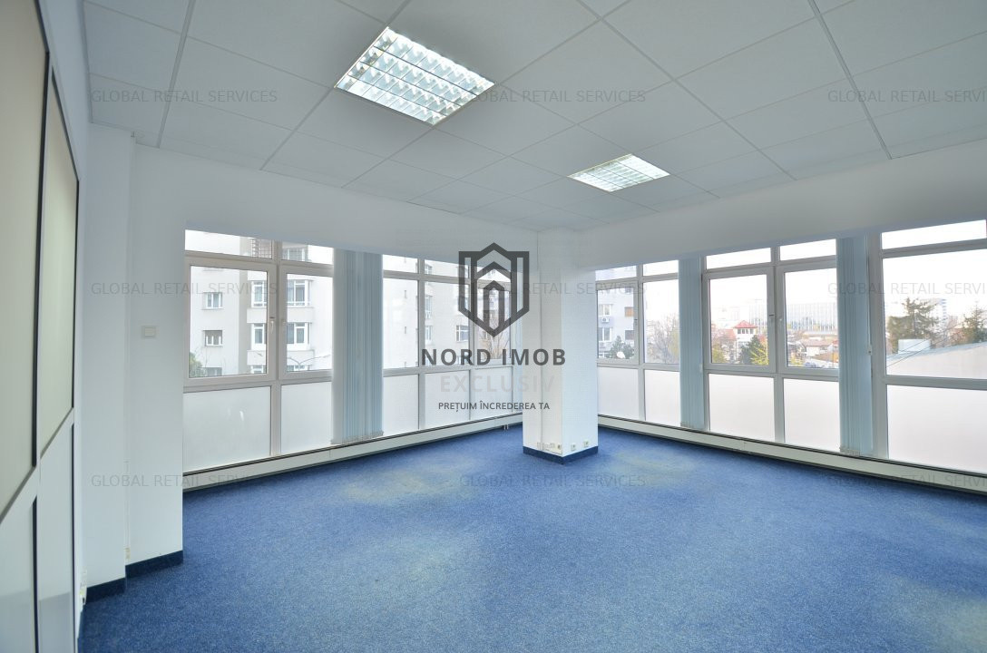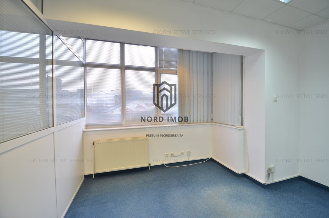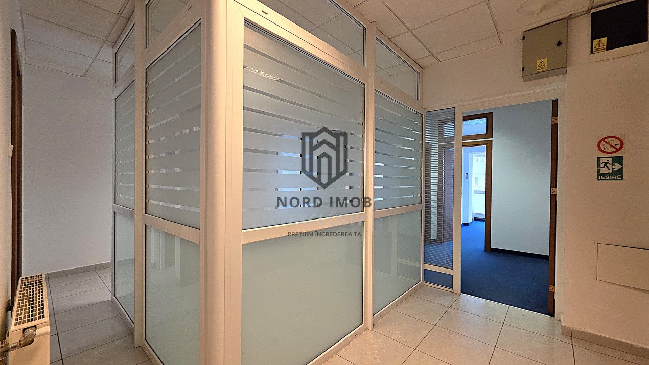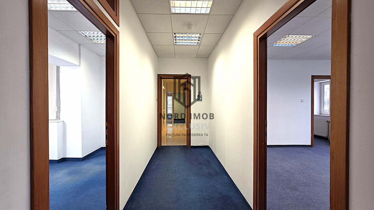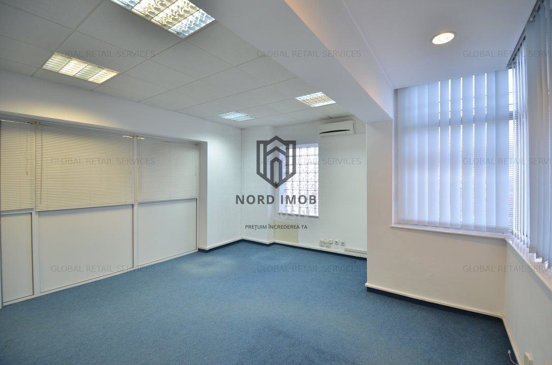 Suprafata disponibila inchiriabila: 242 mp (un etaj integral), din care suprafata utila 209 mp, compartimentata in: 8 birouri, kitchineta, 2 bai si sala de luat masa, precum si 30mp de garaj care poate fi folosit si ca loc de depozitare spatiu primire receptie, chicineta, 2 grupuri sanitare, 8 birouri/camere compartimentate, hol,